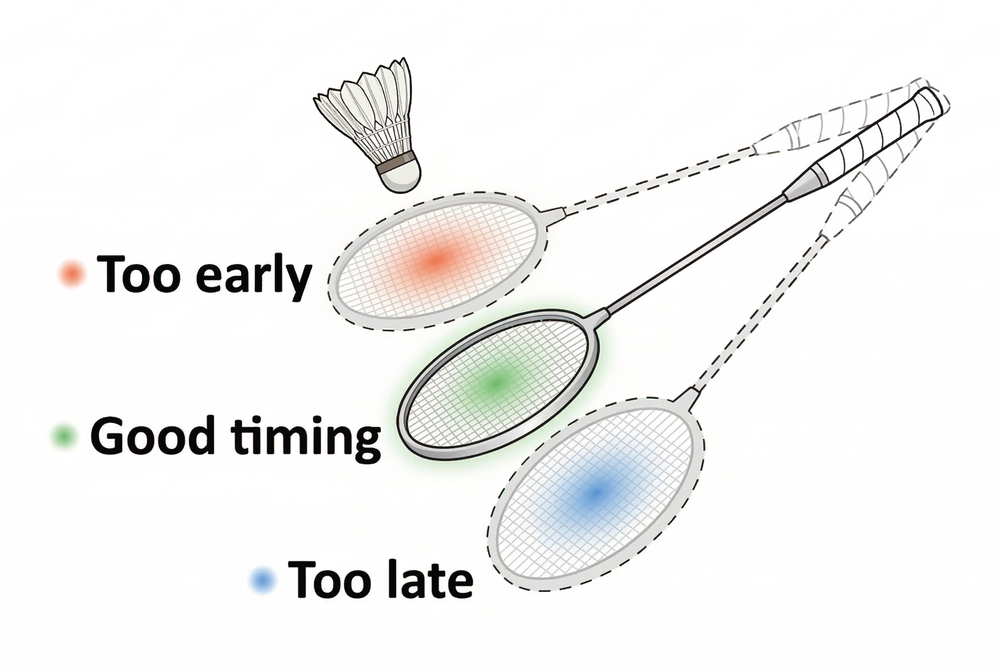When doing a Lift, if the timing is too early, then the Lift will be very high and not far enough. If the timing is too late, then the Lift will be low and maybe too far (or just ends up at the net). When doing a Drive, if the timing is too early, then the shuttle ends up at the net. If the timing is too late, then the shuttle goes high and give the opponent a great chance to give pressure on you.